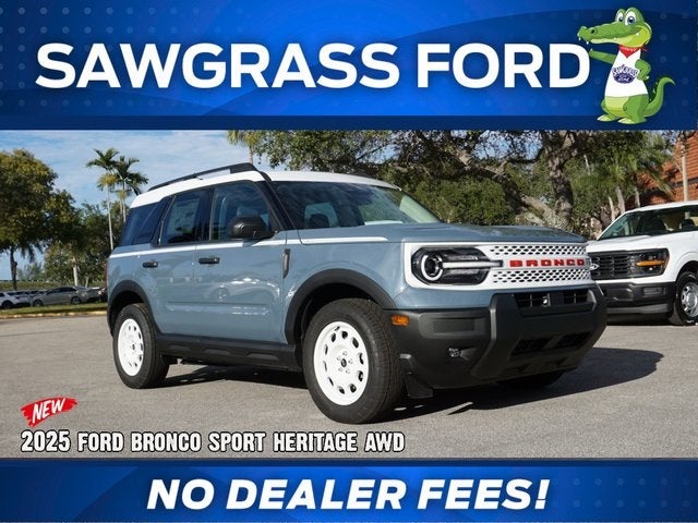 NO GAMES! PRICE PLUS SALES TAX AND TAG ONLY...NO DEALER FEES!!! Here at Sawgrass Ford we NEVER charge a DEALER FEE...WE MAKE IT EASY. 25/30 City/Highway MPG ***NO DEALER FEE***, Bronco Sport Heritage AWD, 4D Sport Utility, 1.5L EcoBoost, 8-Speed Automatic, AWD, Azure Gray Metallic Tri-Coat, Navy Cloth, 4-Wheel Disc Brakes, 6 Speakers, ABS brakes, Air Conditioning, AM/FM radio: SiriusXM, AM/FM Stereo, Auto High-beam Headlights, Automatic temperature control, Brake assist, Compass, Convenience Package, Delay-off headlights, Driver door bin, Driver vanity mirror, Dual front impact airbags, Dual front side impact airbags, Electronic Stability Control, Emergency communication system: SYNC 4 911 Assist, Equipment Group 250A, Four wheel independent suspension, Front anti-roll bar, Front Bucket Seats, Front Center Armrest, Front Driver/Passenger Seat Back Map Pockets, Front reading lights, Fully automatic headlights, Heated 8-Way Power Driver's Seat, Heated door mirrors, Illuminated entry, Knee airbag, LED Fog Lamps, Low tire pressure warning, Occupant sensing airbag, Outside temperature display, Overhead airbag, Overhead console, Panic alarm, Passenger door bin, Passenger vanity mirror, Plaid Cloth Front Bucket Seats, Power door mirrors, Power steering, Power windows, Premium Wrapped Steering Wheel, Radio data system, Rear anti-roll bar, Rear Parking Sensors, Rear reading lights, Rear seat center armrest, Rear window defroster, Rear window wiper, Remote keyless entry, Security system, SiriusXM, Speed control, Speed-sensing steering, Speed-Sensitive Wipers, Split folding rear seat, Steering wheel mounted audio controls, SYNC 4 w/Enhanced Voice Recognition, Tachometer, Telescoping steering wheel, Tilt steering wheel, Traction control, Trip computer, Universal Garage Door Opener (UGDO), Variably intermittent wipers, Wheels: 17 Oxford White-Painted Aluminum.