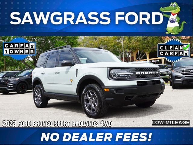 NO GAMES! PRICE PLUS SALES TAX AND TAG ONLY...NO DEALER FEES!!! Here at Sawgrass Ford we NEVER charge a DEALER FEE...WE MAKE IT EASY. CARFAX One-Owner. ***NO DEALER FEE***, ***CARFAX ONE OWNER***, **CLEAN CARFAX**, ***FREE CARFAX HISTORY REPORT***, Bronco Sport Badlands 4WD, 4D Sport Utility, EcoBoost 2.0L I4 GTDi DOHC Turbocharged VCT, 8-Speed Automatic, 4WD, Cactus Gray, Ebony w/Cloth Front Bucket Seats, 3.80 Axle Ratio, 4-Wheel Disc Brakes, ABS brakes, Air Conditioning, AM/FM radio: SiriusXM, AM/FM Stereo, Auto High-beam Headlights, Auto-Dimming Rear-View Mirror, Automatic temperature control, B & O Sound System by Bang & Olufsen w/HD Radio, Body-Colored Door Handles, Brake assist, Class II Trailer Tow Package w/Trailer Sway Control, Compass, Delay-off headlights, Driver door bin, Driver vanity mirror, Dual front impact airbags, Dual front side impact airbags, Dual-Zone Electronic Automatic Temperature Control, Electronic Stability Control, Emergency communication system: SYNC 3 911 Assist, Equipment Group 400A, Evasive Steering Assist, Ford Co-Pilot360 Assist+, Four wheel independent suspension, Front anti-roll bar, Front Bucket Seats, Front Center Armrest, Front fog lights, Front reading lights, Fully automatic headlights, HD Radio, Heated door mirrors, Heated front seats, Heated Steering Wheel, Illuminated entry, Intelligent Adaptive Cruise Control w/Stop & Go, Knee airbag, Leather-Trimmed Heated Sport Contour Bucket Seats, Low tire pressure warning, Memory Driver's Seat & Sideview Mirror, Navigation System, Occupant sensing airbag, Outside temperature display, Overhead airbag, Overhead console, Panic alarm, Passenger door bin, Passenger vanity mirror, Power door mirrors, Power driver seat, Power steering, Power windows, Premium Package, Radio data system, Rear anti-roll bar, Rear Parking Sensors, Rear reading lights, Rear seat center armrest, Rear window defroster, Rear window wiper, Remote keyless entry, Remote Start System, Security system, SiriusXM, Speed control, Speed-sensing steering, Speed-Sensitive Wipers, Split folding rear seat, Steering wheel mounted audio controls, SYNC 3 Communications & Entertainment System, SYNC 3/Apple CarPlay/Android Auto, Tachometer, Telescoping steering wheel, Tilt steering wheel, Traction control, Trip computer, Unique Style Cloth Htd Sport Contour Bucket Seats, Universal Garage Door Opener (UGDO), Variably intermittent wipers, Voice-Activated Touchscreen Navigation System, Wheels: 17 Carbonized Gray-Painted Aluminum, Wireless Charging Pad. THIS VEHICLE INCLUDES THE FOLLOWING FEATURES AND OPTIONS: Class II Trailer Tow Package w/Trailer Sway Control, Equipment Group 400A, Ford Co-Pilot360 Assist+ (Evasive Steering Assist, Intelligent Adaptive Cruise Control w/Stop & Go, and Voice-Activated Touchscreen Navigation System), Premium Package (Auto-Dimming Rear-View Mirror, Body-Colored Door Handles, Dual-Zone Electronic Automatic Temperature Control, HD Radio, Heated Steering Wheel, Leather-Trimmed Heated Sport Contour Bucket Seats, Memory Driver's Seat & Sideview Mirror, Rear Parking Sensors, Remote Start System, Universal Garage Door Opener (UGDO), and Wireless Charging Pad), Bronco Sport Badlands 4WD, 4D Sport Utility, EcoBoost 2.0L I4 GTDi DOHC Turbocharged VCT, 8-Speed Automatic, 4WD, Cactus Gray, Ebony w/Cloth Front Bucket Seats, 3.80 Axle Ratio, 4-Wheel Disc Brakes, ABS brakes, Air Conditioning, AM/FM radio: SiriusXM, AM/FM Stereo, Auto High-beam Headlights, Automatic temperature control, B & O Sound System by Bang & Olufsen w/HD Radio, Brake assist, Compass, Delay-off headlights, Driver door bin, Driver vanity mirror, Dual front impact airbags, Dual front side impact airbags, Electronic Stability Control, Emergency communication system: SYNC 3 911 Assist, Four wheel independent suspension, Front anti-roll bar, Front Bucket Seats, Front Center Armrest, Front fog lights, Front reading lights, Fully automatic headlights, Heated door mirrors, Heated front seats, Illuminated entry